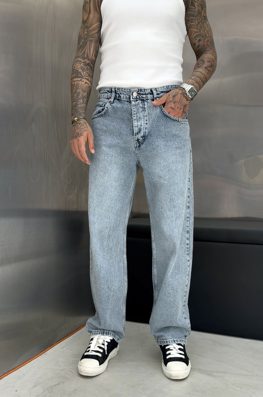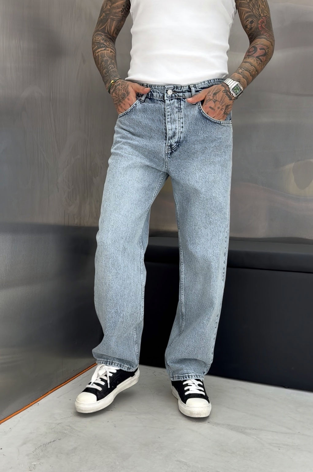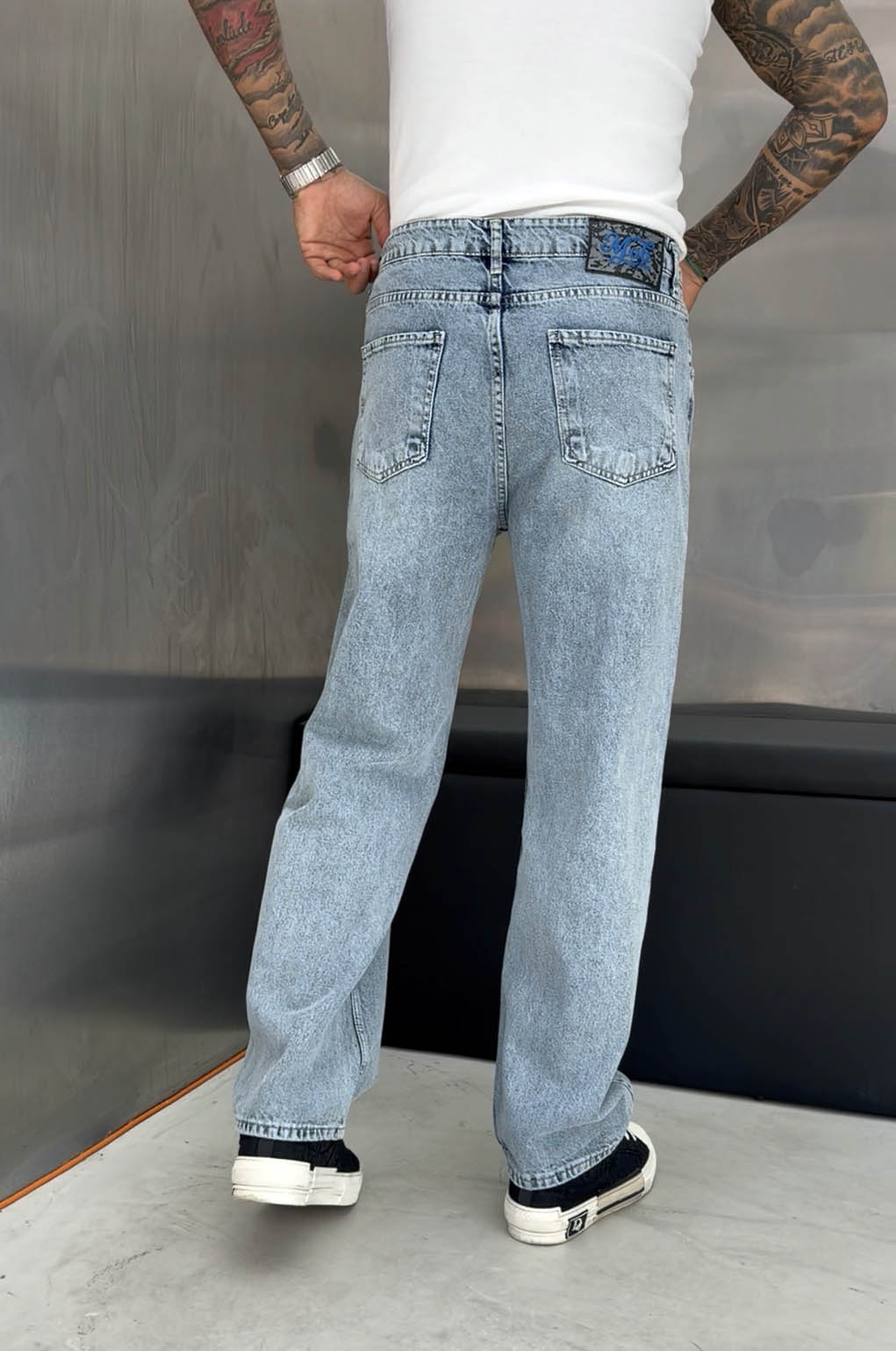 Αν ψάχνεις ένα τζιν που να συνδυάζει άνεση με καθαρό στυλ, αυτό το ανοιχτό μπλε baggy fit παντελόνι
