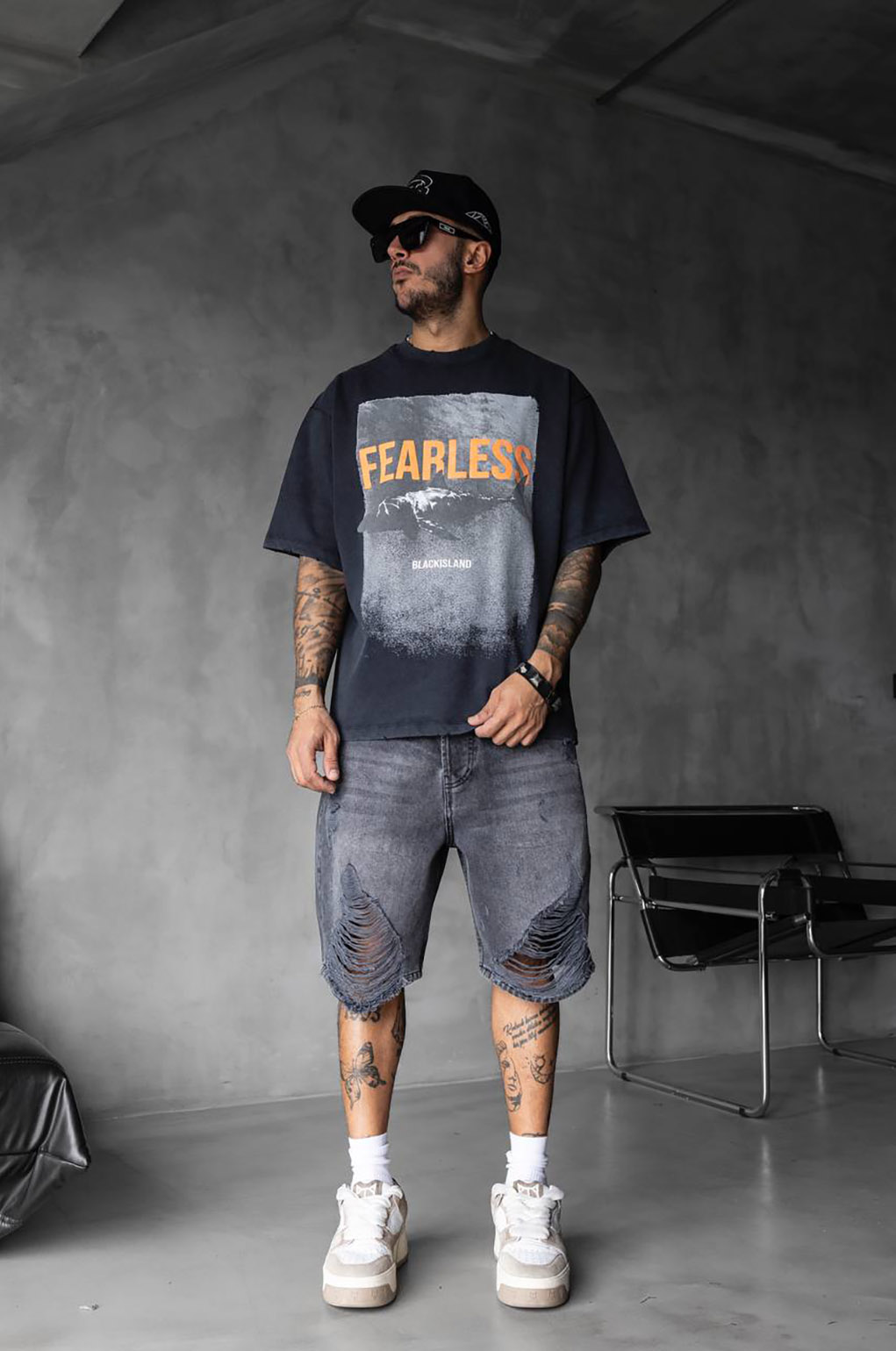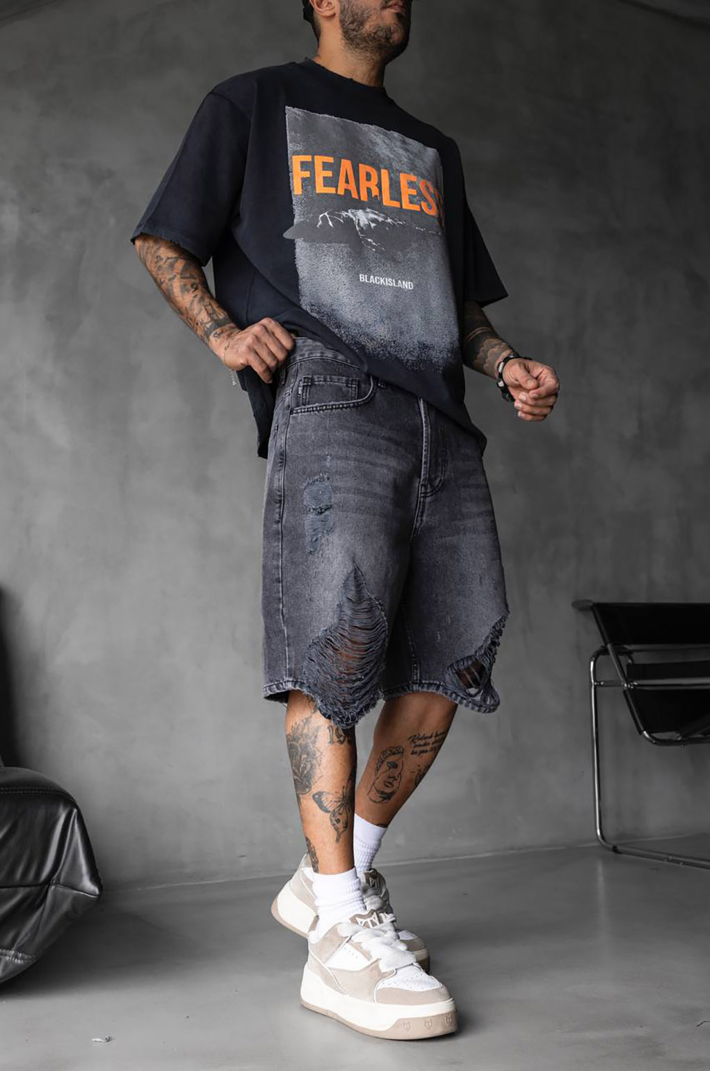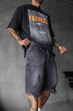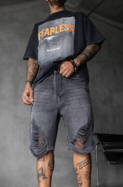 Αυτή η ανδρική τζιν βερμούδα σε ξεθωριασμένο μαύρο χρώμα είναι η επιτομή του street style με έντονα σκισίματα και μοναδικό χαρακτήρα.