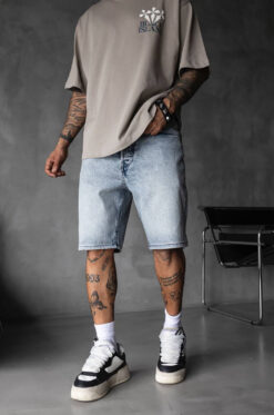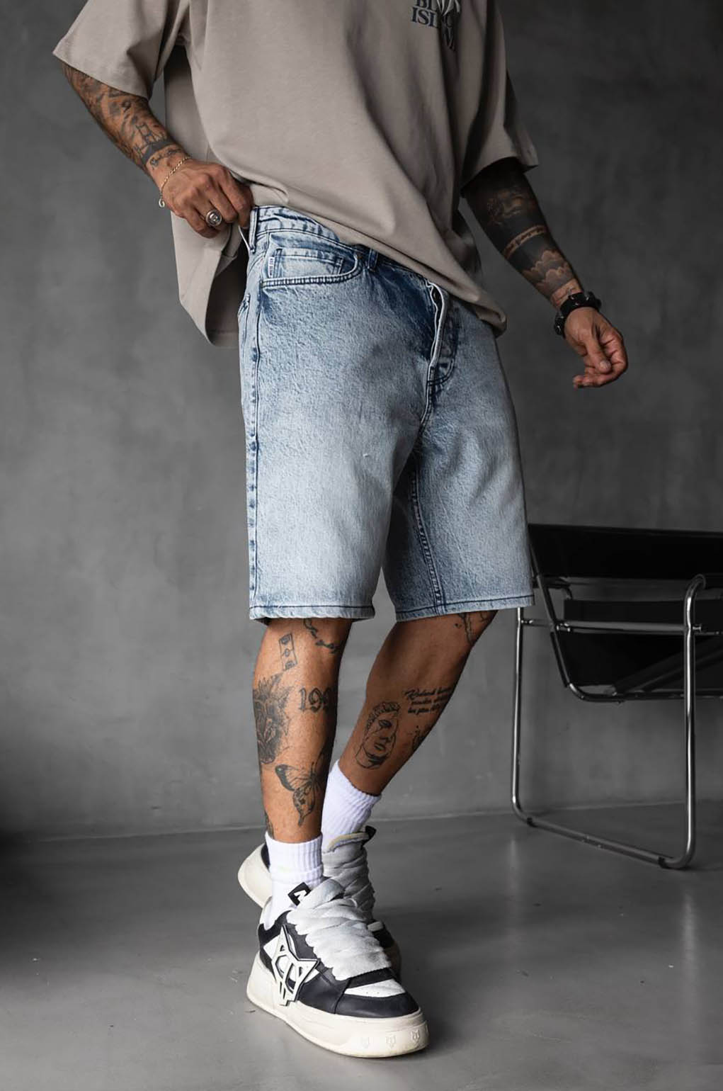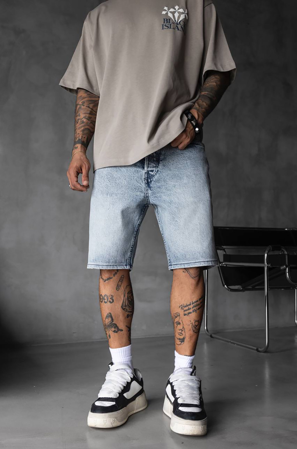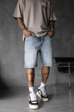 Premium ανδρική τζιν βερμούδα σε ξεθωριασμένο μπλε χρώμα.