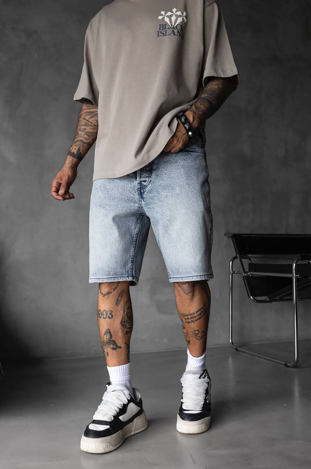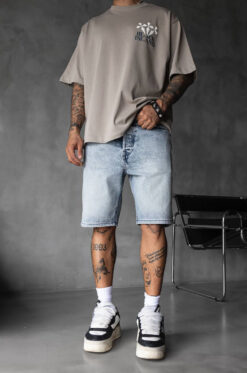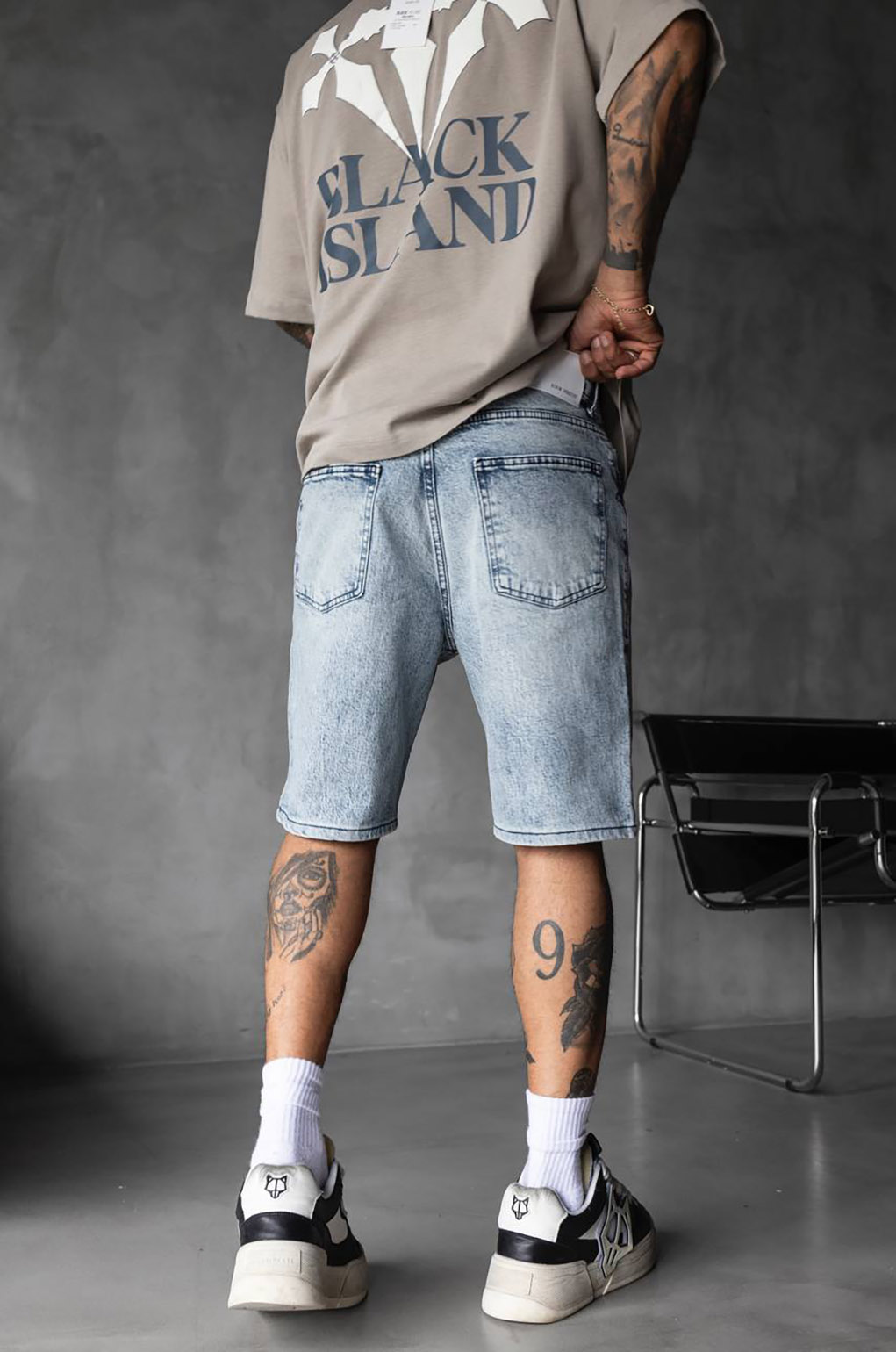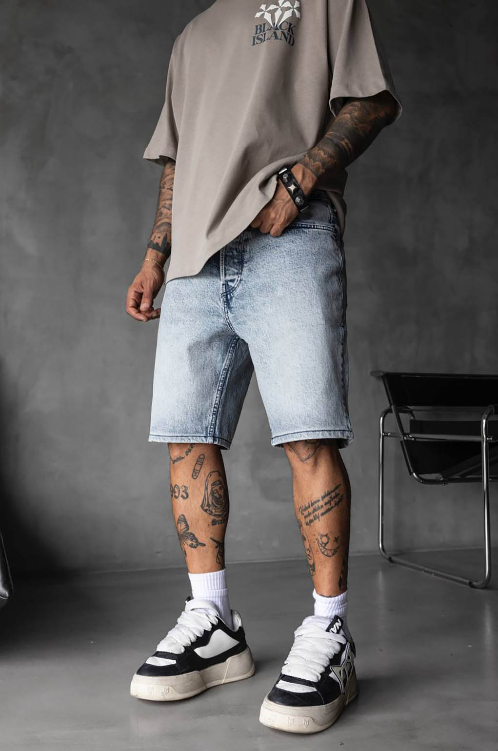 Premium ανδρική τζιν βερμούδα σε ξεθωριασμένο μπλε χρώμα.