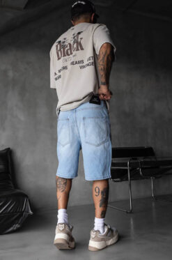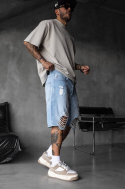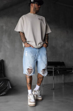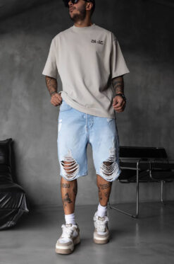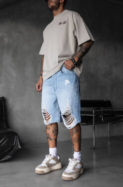 Δώσε ένταση στο street style σου με αυτή την ανδρική βερμούδα σε ανοιχτό γαλάζιο denim και εντυπωσιακά σκισίματα.