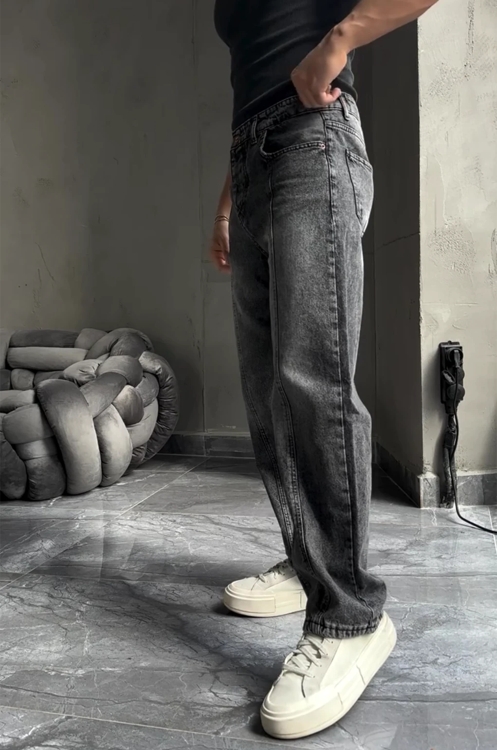 Η γραμμή του πέφτει ίσια και γεμάτα, δημιουργώντας ένα πιο structured baggy σχήμα που ξεχωρίζει.