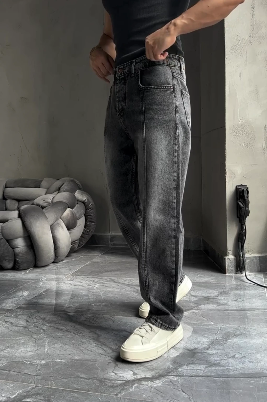 Για όσους θέλουν κάτι πιο έντονο από το κλασικό denim, αυτό το σκούρο γκρι baggy fit παντελόνι
