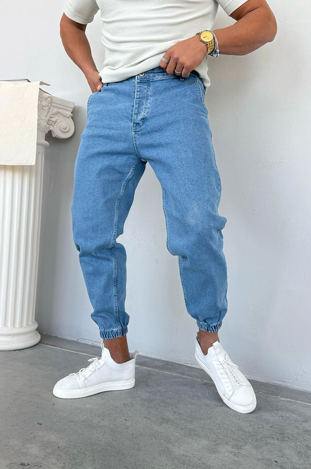 Αναβάθμισε το casual ντύσιμό σου με αυτό το κομψό τζιν παντελόνι loose fit και λαστιχένια μπατζάκια: